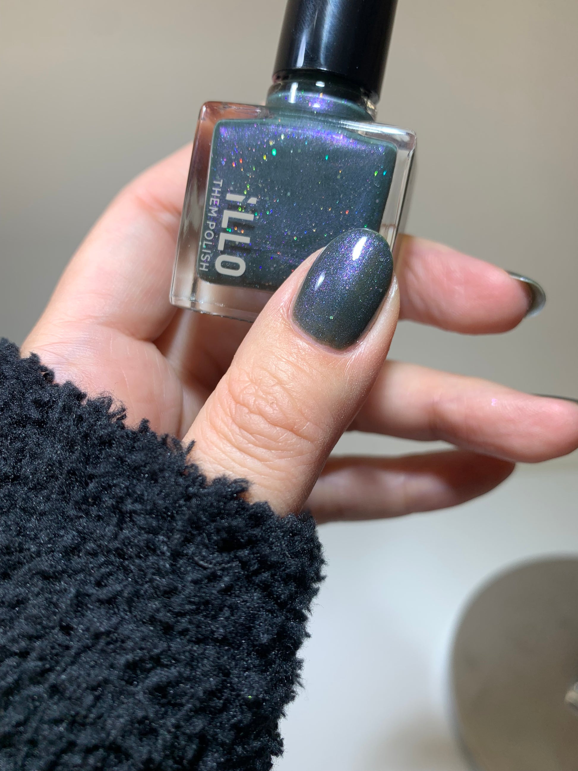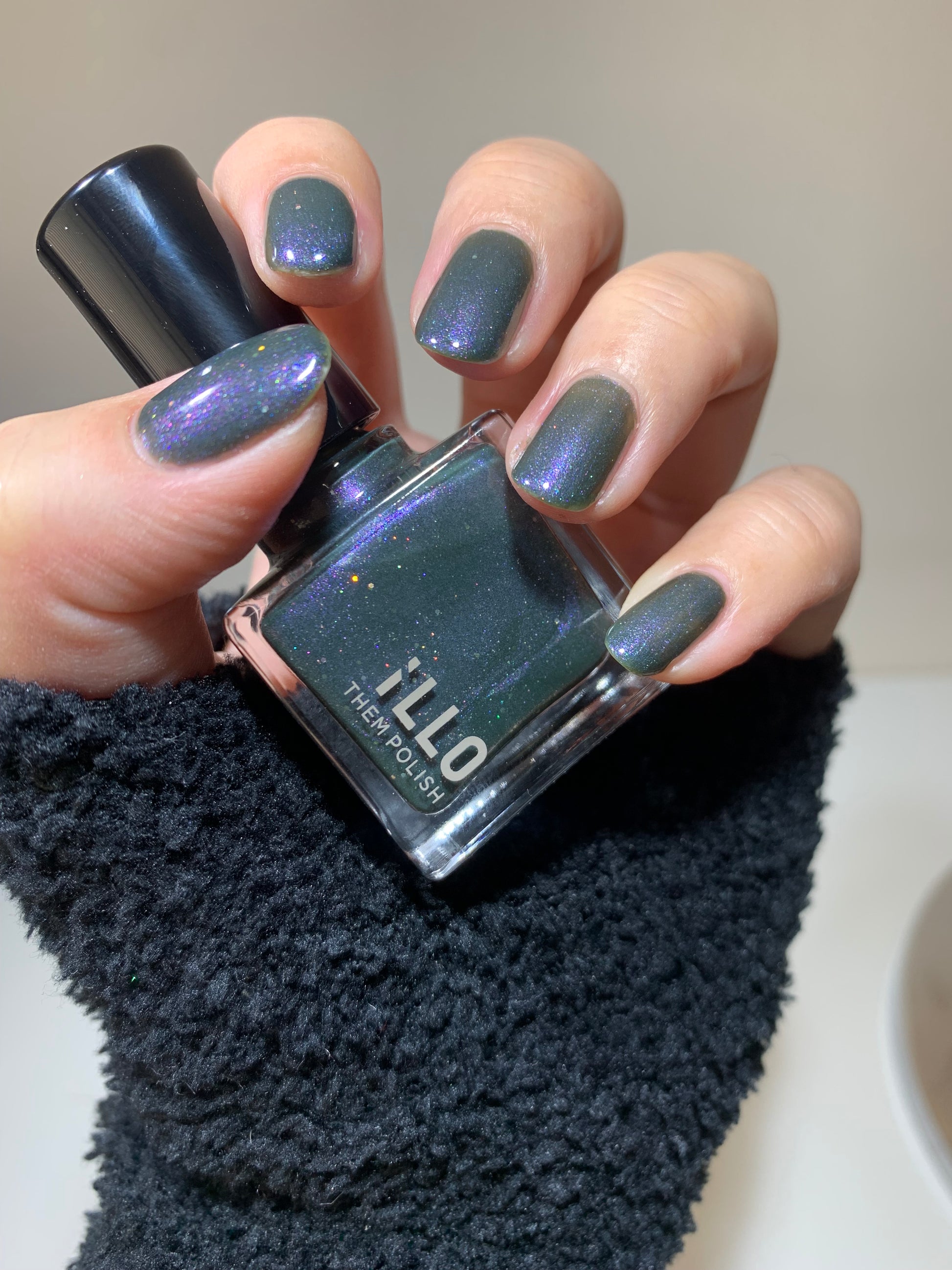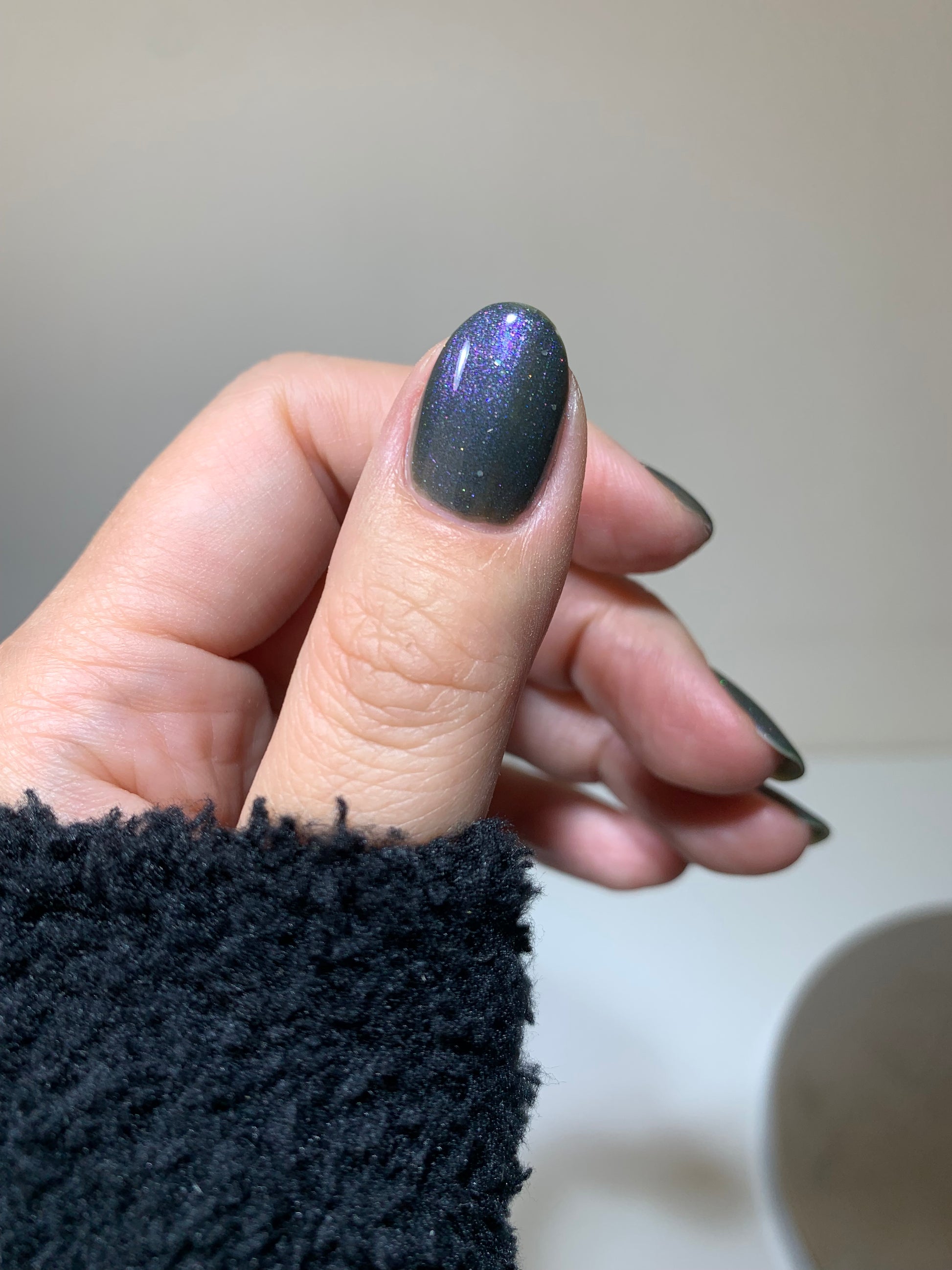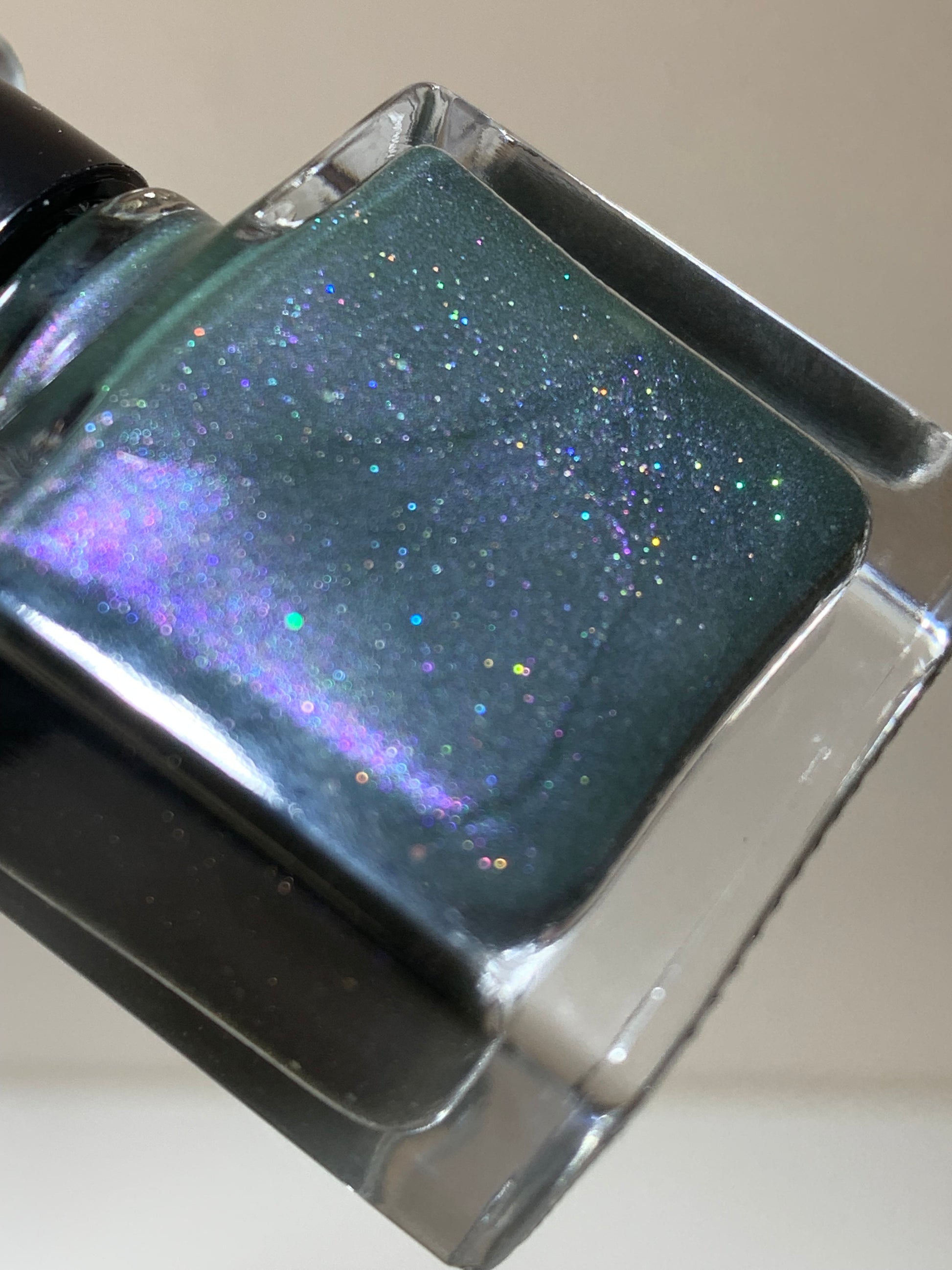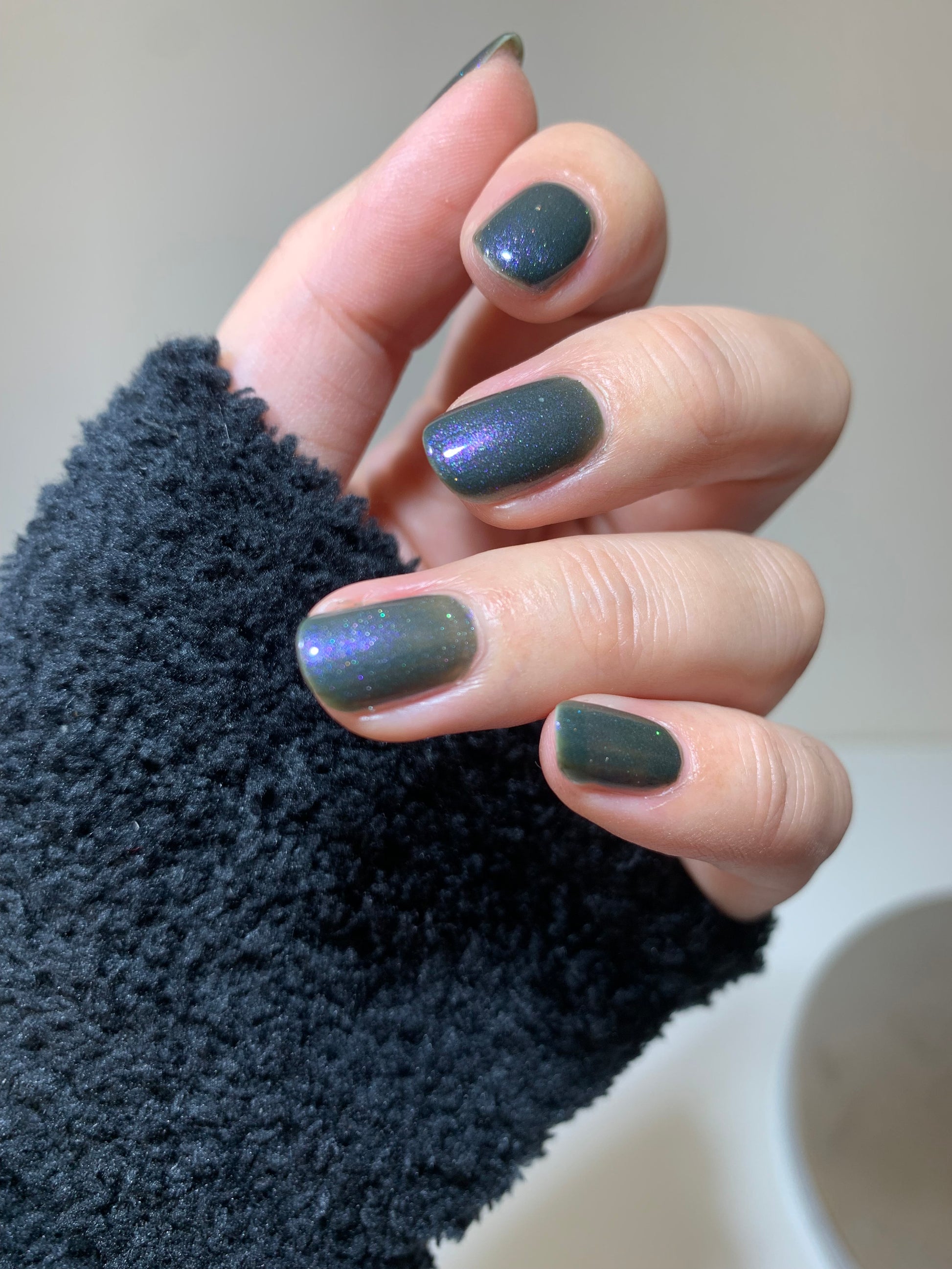 深いボトルグリーンに、紫の偏光パールと微細なラメがしんと降り積もるフロストナイト