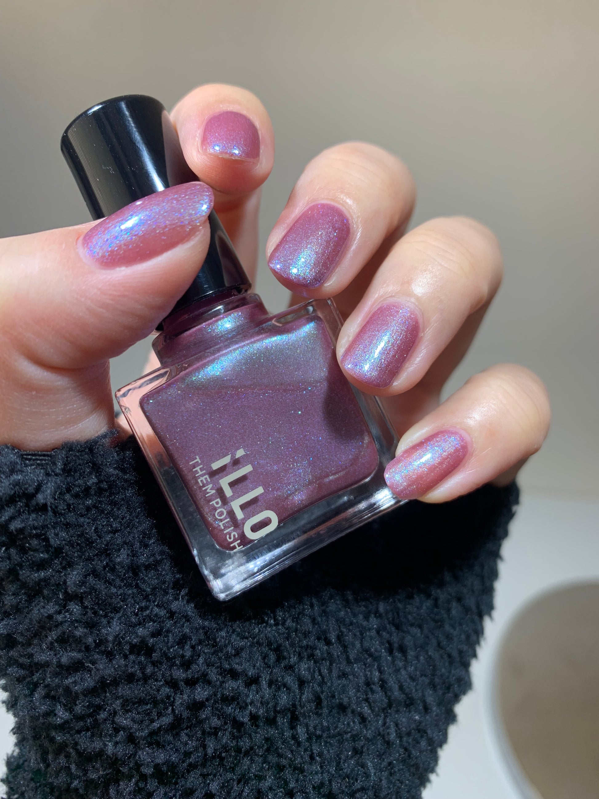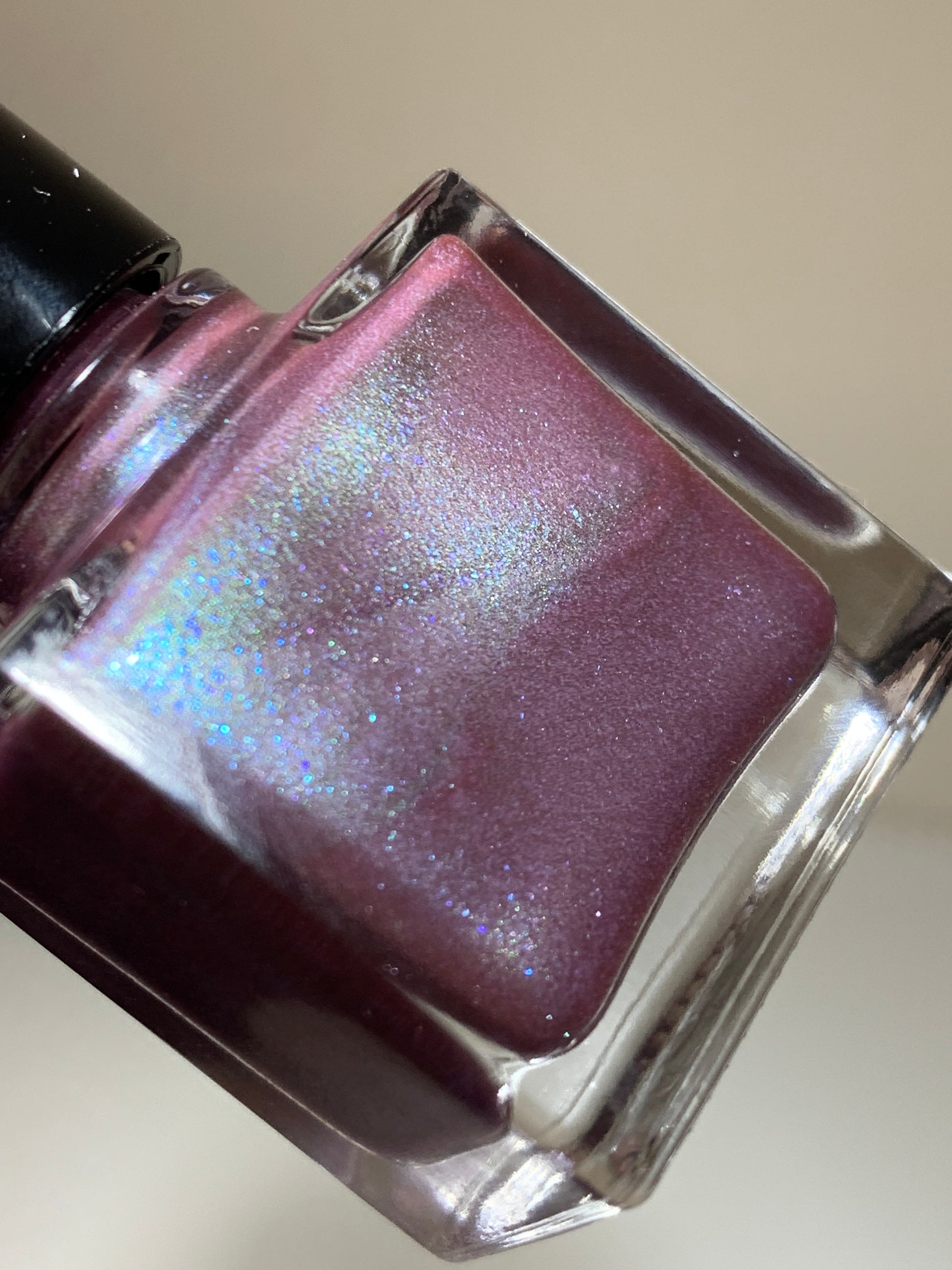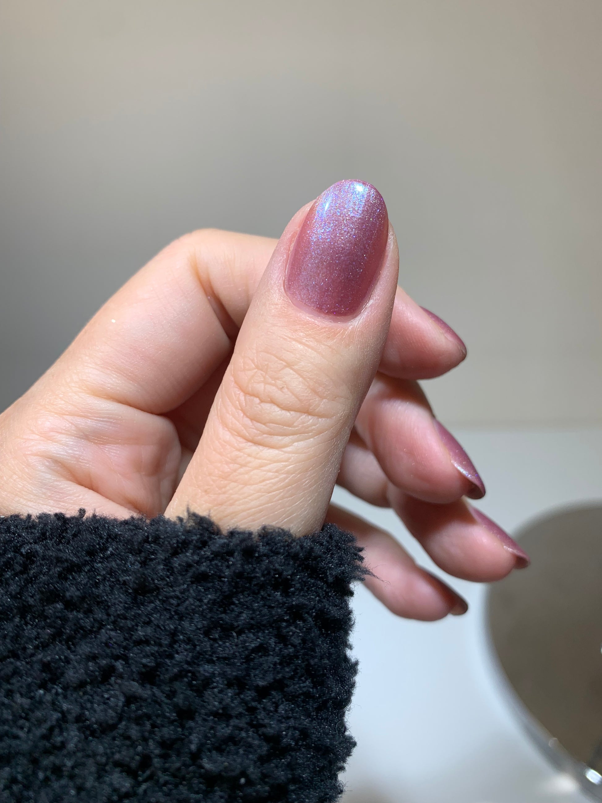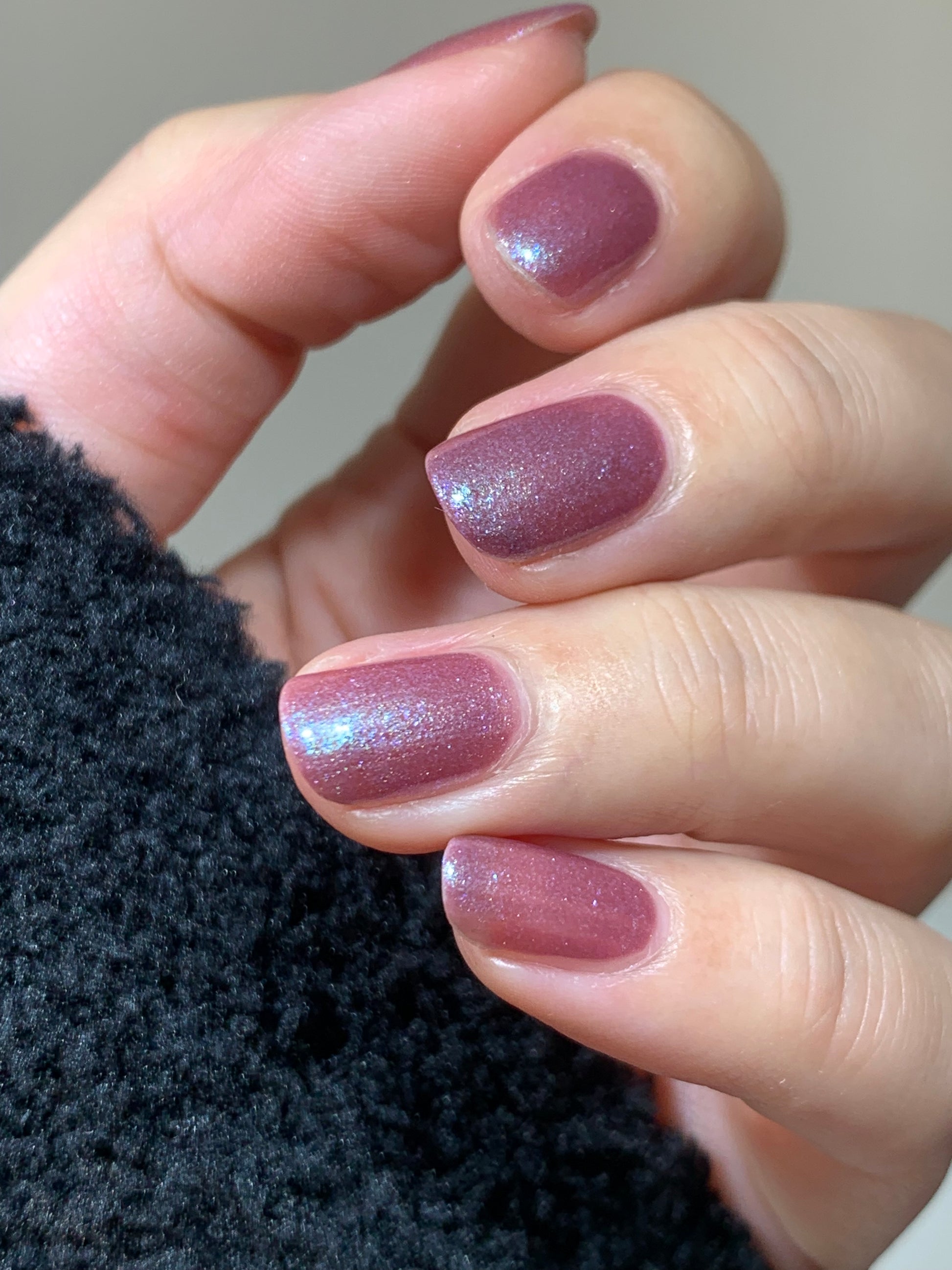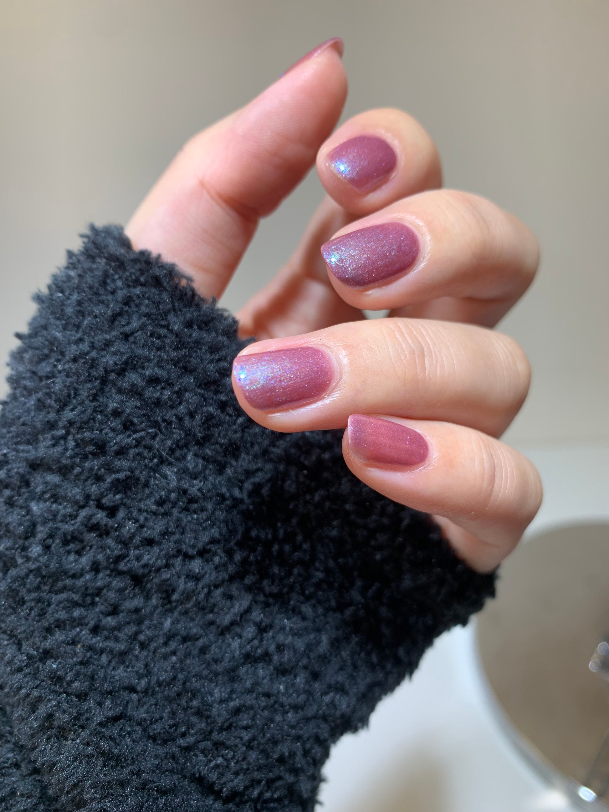 スモーキーなこっくりとした紫に、青の微細ラメが霧のように溶け込むカラー